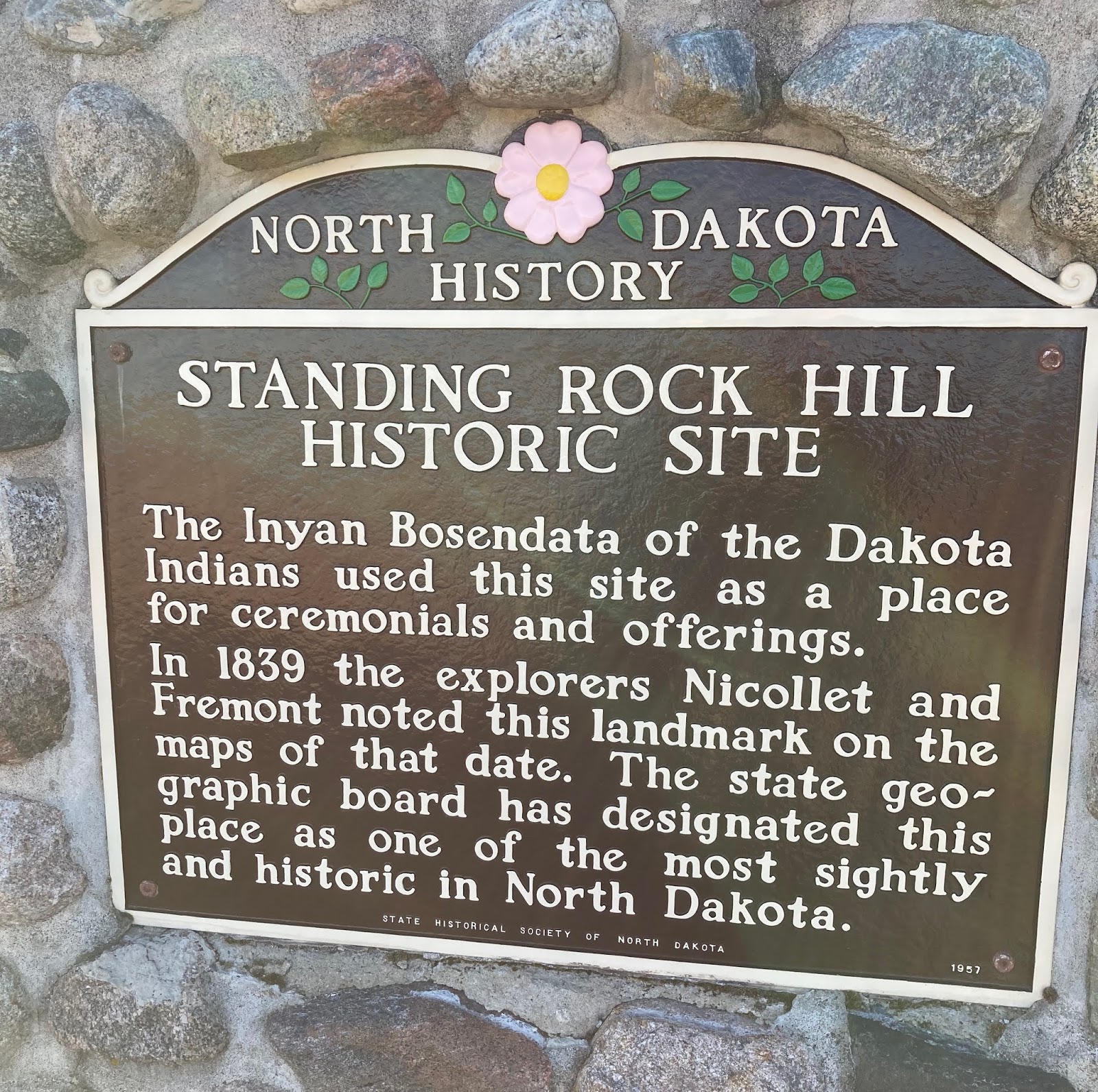 Nicollet made accurate maps most likely with the use of a sextant and aided by a barometer he determined altitude. These explorers noted the Standing Rock site on their maps which Indians called Inyan Bosndata. The hill on which it stands is the highest around and stands at 1490 feet which is about 25-30 higher than Bears Den Hillock near the fort. The stone itself sits upright on another level higher yet. State historical accounts assert that the top level is man-made, probably by those Indians who used it for their ceremonials and offerings.